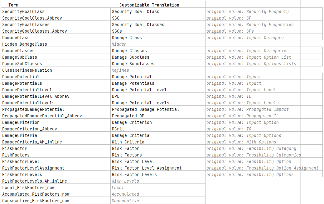 The renaming-option in the Terminology Profile also includes terms used in your Item Definition—for example, if you prefer a different element name for “Channels”—as well as terminology used in the TARA—such as replacing the default term “Control” with one that fits your context better. You can also customize the field names of elements and the prompt phrases shown by assistants, such as the instructional or guiding text for specific element operations. Additionally, the profile allows you to define Name Patterns and Title Patterns, which we will explain in more detail in the following sections.